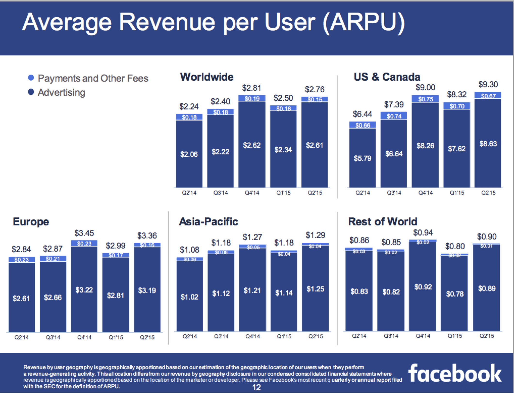 For pre-revenue companies, investors will often compare the prospects of a company against the known ARPU for established companies. For example, we know that Facebook generated $9.30 ARPU in FY2015Q2 from its U.S. and Canada users: