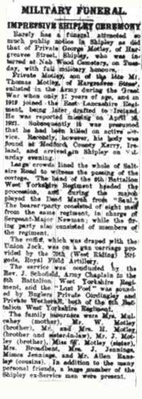1927 Jan 18. According to Shipley Times and Express his body was finally buried in England. Son of late Thomas Motley of 10 Hargreave St, Shipley. Buried at Nab Wood Cemetery. His mother is recorded as Mrs Mulcahey when she attended the funeral of her son in 1927. There is a record of Sarah E Motley marrying Jeremiah Mulcahey in 1925. Buried in Plot F470, Nab Wood Cemetery, Bingley: Plot F470.3 The burial plot was purchased by Sarah Mulcahey.