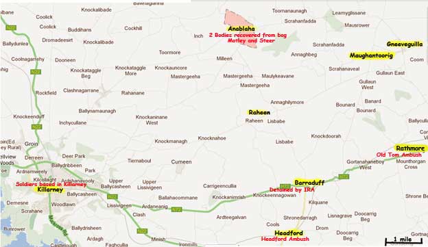 The local Guarda Report by Sgt James Crehan who found the bodies in Jan 1926, says that the information given to him indicated that the 2 men " either deserted or wandered away from their post in Killarney and came on to Barraduff where they were taken prisoner by a party of the Irish Forces. They were kept prisoner in several farmhouses around the townlands of Anablaha, Raheen, Maughantoorig, Gneeveguilla for a period of about 6 months and they were eventually shot and buried in Anablaha Bog."