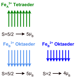 Diese Konstellation bevorzugt eine antiparallele Anordnung der magnetischen Momente der Untergitter, deren Untergitterionen zueinander eine parallele Spin-Anordnung aufweisen. In Magnetit koppeln die effektiven Momente der A-/B-Untergitter antiferromagnetisch über Superaustausch. Das Fe2+-Ion besitzt den Spin S=2 (4µB) und das Fe3+-Ion den Spin S = 5/2 (5µB), so dass sich bei der oben erklärten antiparallelen Anordnung der Fe3+-Ionen auf dem A-Untergitter bzw. der Fe2+/3+-Ionen auf dem B-Untergitter ein effektives Sättigungsmoment von (5-5+4)µB =4µB ergibt.