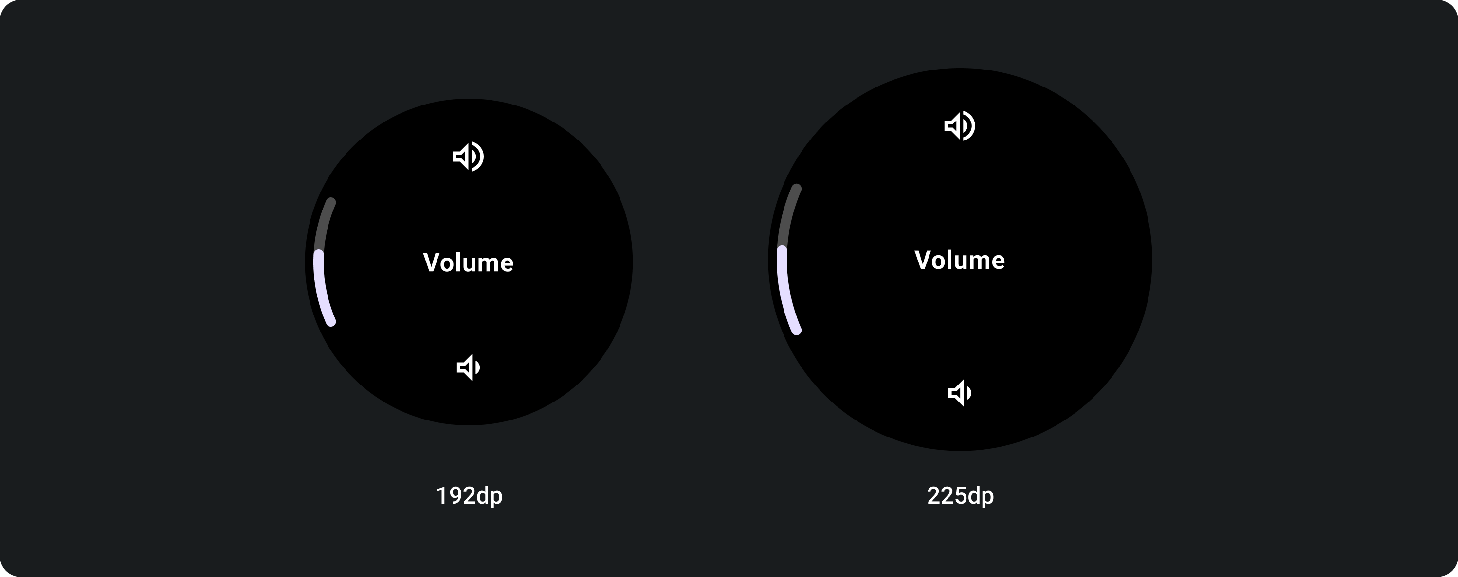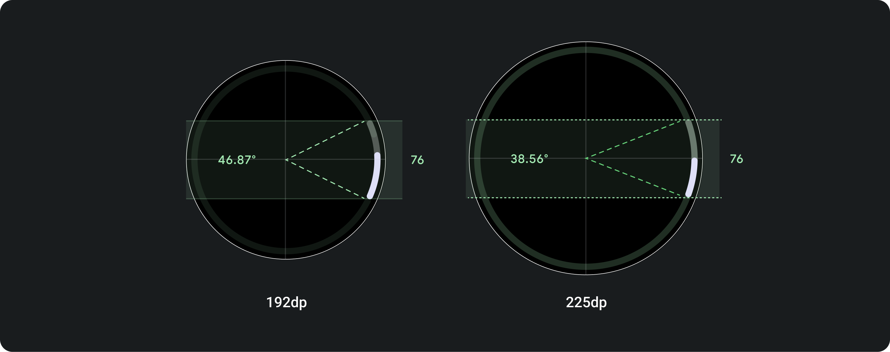 The arc of the indicator is always 76 dp high (doesn’t scale proportionally) meaning only the degree changes as you go up in size.