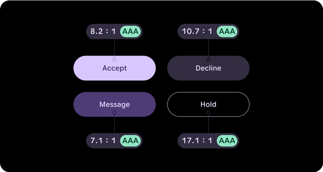 Watches are designed with a black background, instead of the tinted background that phone devices use. While dark themes are meant for low-light environments and light themes for daylight, watch UIs need to function seamlessly both day and night. Therefore, color tokens for watches must be specifically tailored.