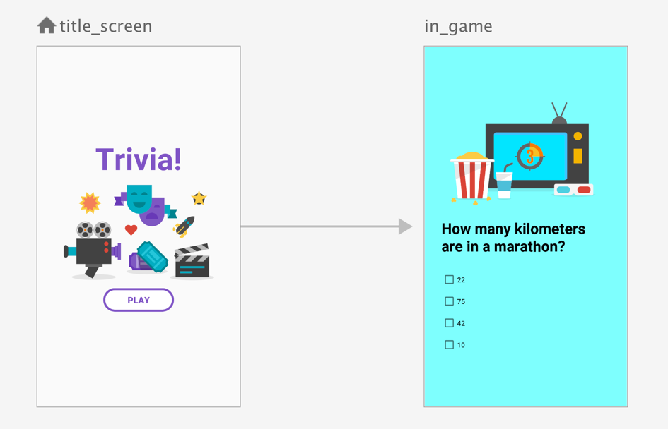Let’s say you are building a trivia game. The game starts with a title_screen and navigates to an in_game screen when the user clicks play.