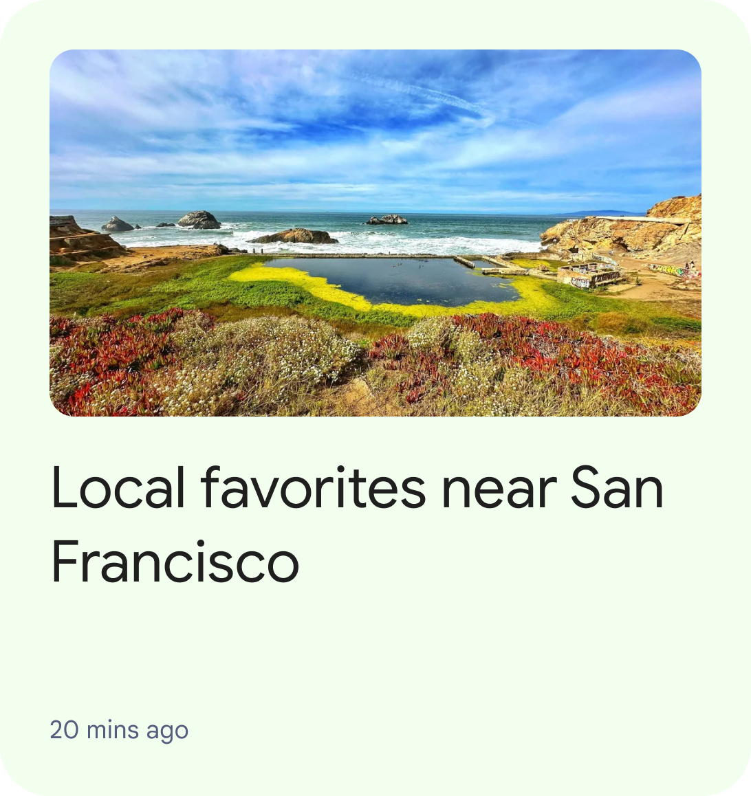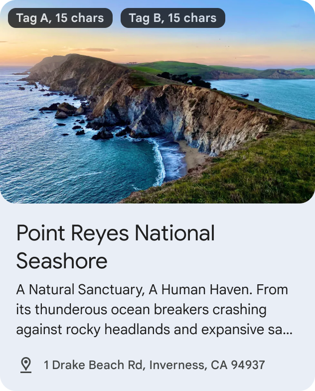 Recommendation clusters show personalized travel & event suggestions from an individual developer partner. These recommendations can be personalized to the user or generalized (for example, trending items). Use these to surface articles, events, lodging, or places of interest recommendations.