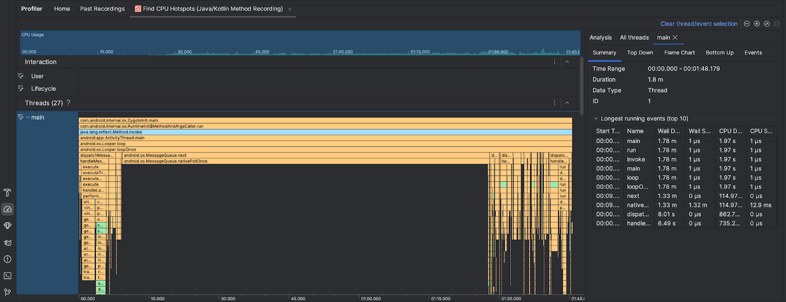 After you run the Find CPU Hotspots task the Android Studio Profiler provides the following information: