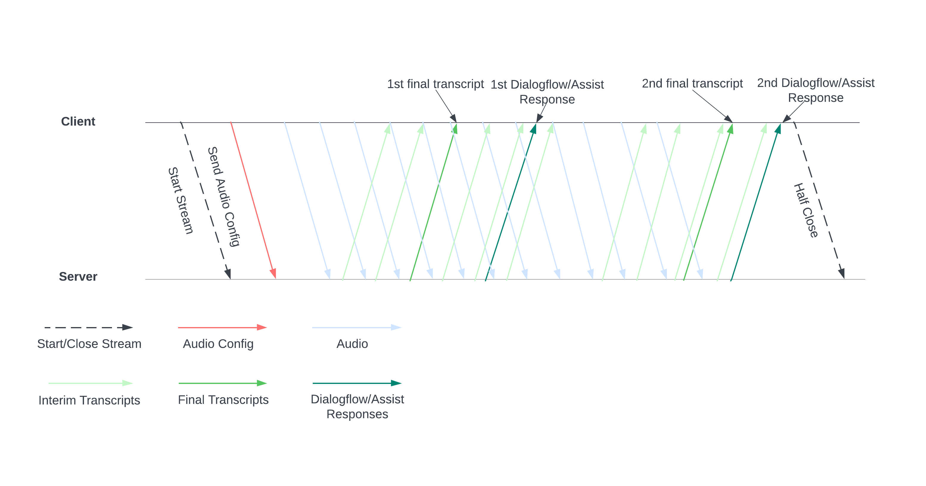 Start a stream by sending an audio configuration to the server. Then you send audio files, and the server sends you a transcript or suggestions for a human agent. Send more audio data for more transcripts and suggestions. This exchange continues until you end it by half closing the stream.