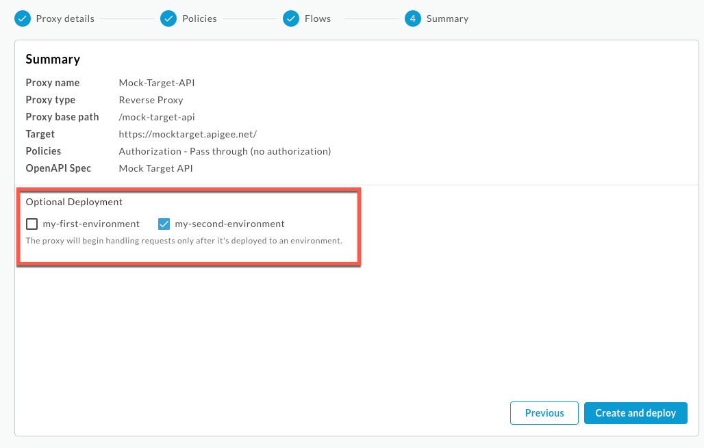 | Proxy name | Name of the API proxy. For example: Mock-Target-API. |