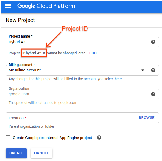 This section describes how to create a new Google Cloud project. If you want to use an existing Google Cloud project (of which you are an owner) with hybrid, skip to Step 3: Enable APIs.