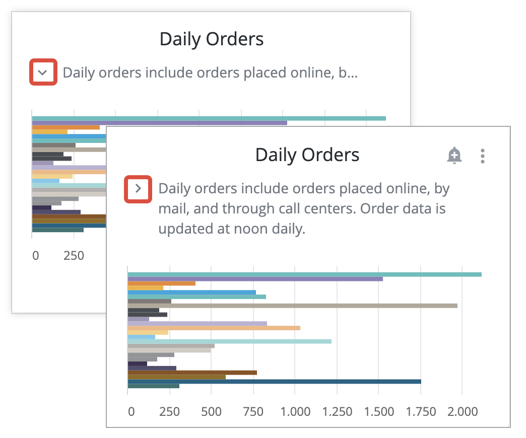 For example, you have a dashboard tile with a visualization that uses a grid layout of four small charts. If you size the tile to be short and wide, the small charts appear as one row of four. If you size the tile as a square, the small charts reposition to two rows of two. If you size the tile to be narrow but tall, the charts reposition to four rows of one.
