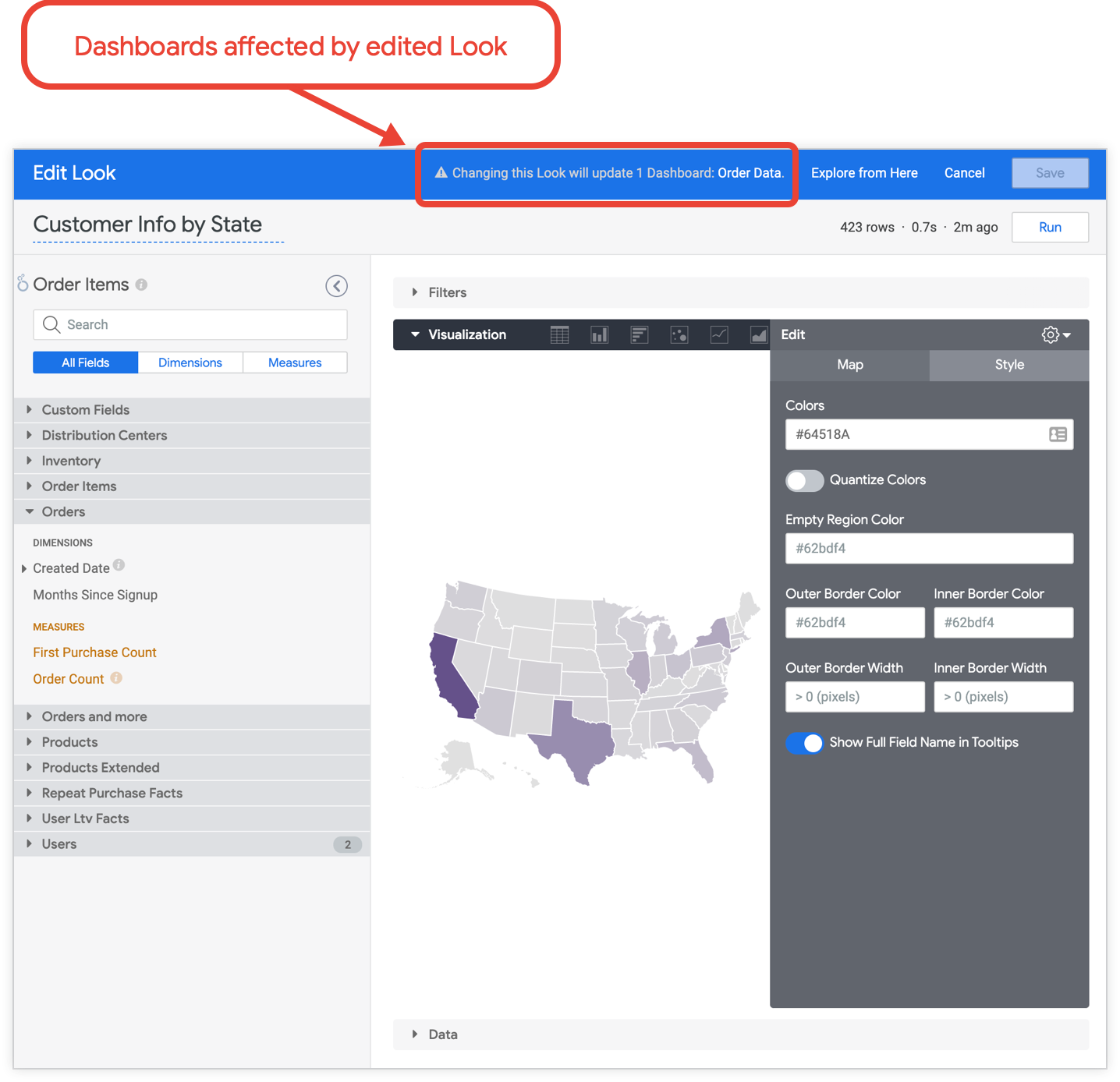 If you are editing a Look, the Edit Look toolbar displays the dashboards that contain tiles linked to that Look. Those dashboards will be affected by your changes. If you are editing a query tile, you will not see a list of dashboards affected in the edit pane, because your edits only affect the tile and dashboard you are in.