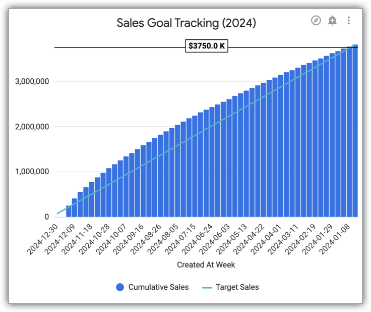 In this section, you'll create the Sales Goal Tracking (2024) tile, which will show your cumulative sales over time compared to a yearly sales goal and uses table calculations to define the running total and the target sales.