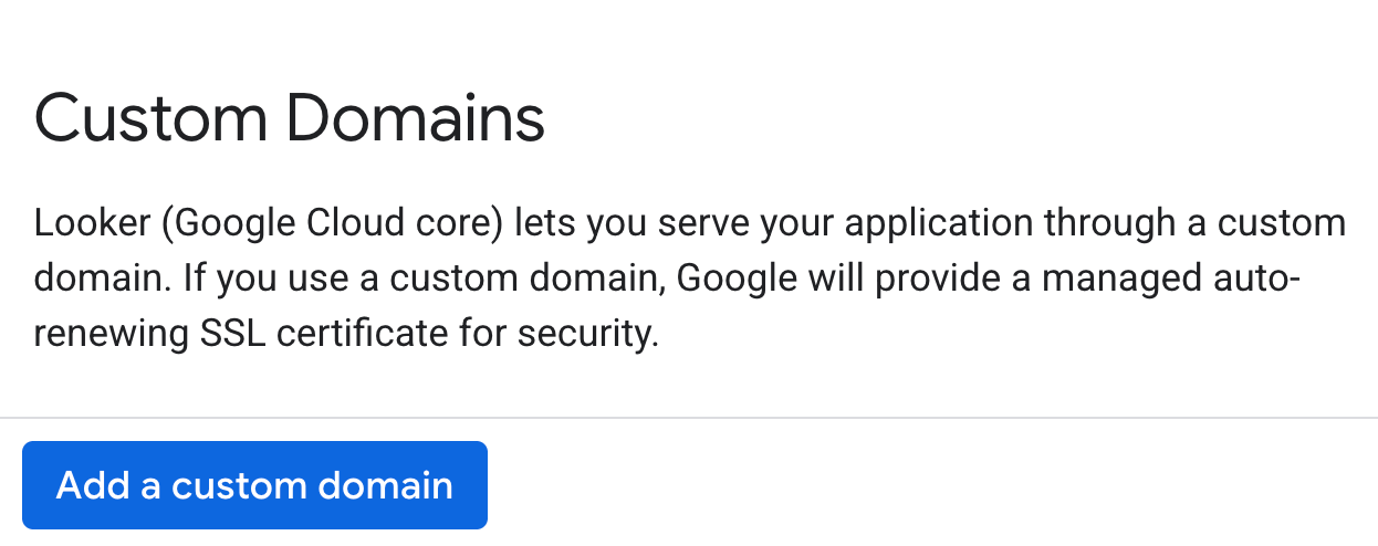 This page explains how to configure a custom domain for your Looker (Google Cloud core) private connections instance using Google-managed certificates. This simplified method eliminates the need for you to obtain, upload, and manage your own SSL certificates or configure a reverse proxy for TLS termination.