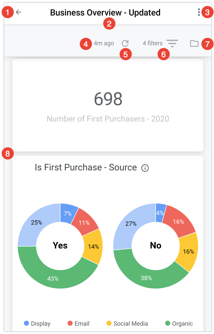 - Dashboard filters: Shows any dashboard filters that have been added to a dashboard. You can temporarily change dashboard filter values while in the app to see how the data changes.
