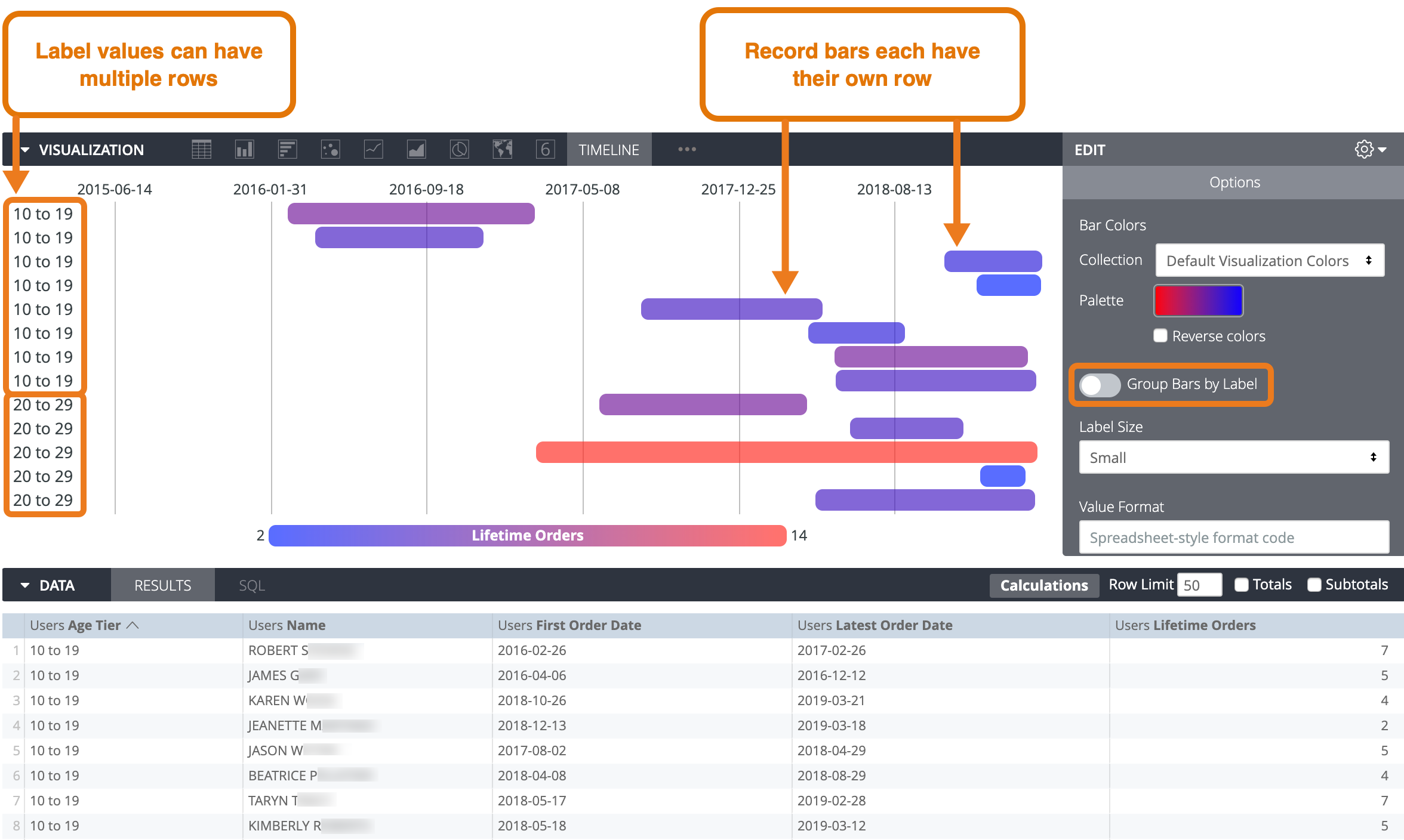 If you turn on Group Bars by Label, all records that share the same label value appear as individual bars on the same row in the visualization. For example, consider a set of user data, where each user belongs to an age tier. If the age tier is the label field and the user's name is the detail field, then the visualization displays one row per age tier, with one or more users' names displayed as bars on that age tier's row.
