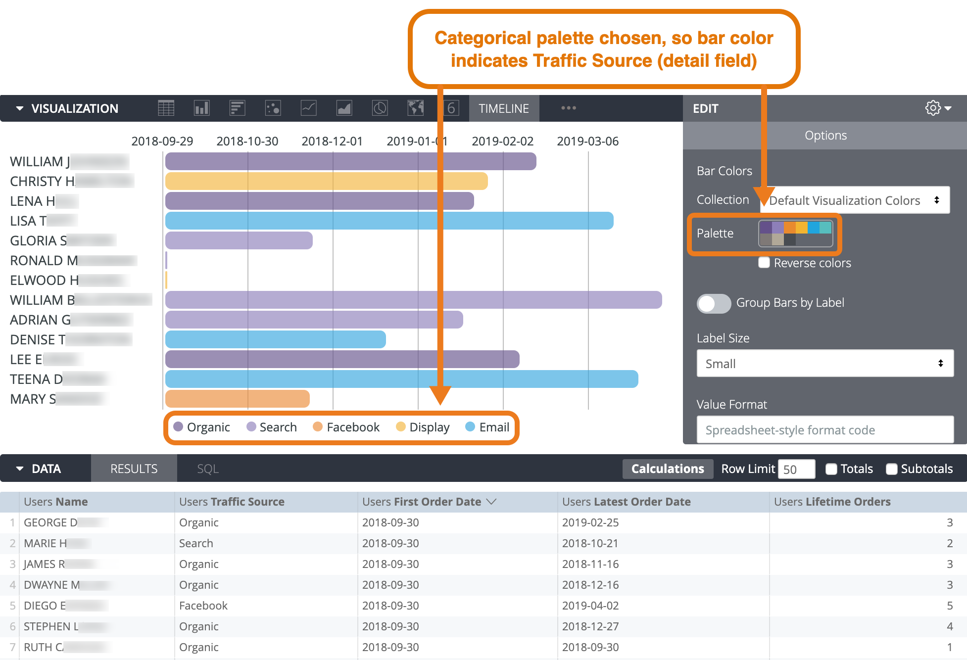 For example, you can use a timeline chart to show the timespan between a customer's first order date and the customer's most recent order date. Each timespan can be colored to indicate the number of orders that the customer has placed.