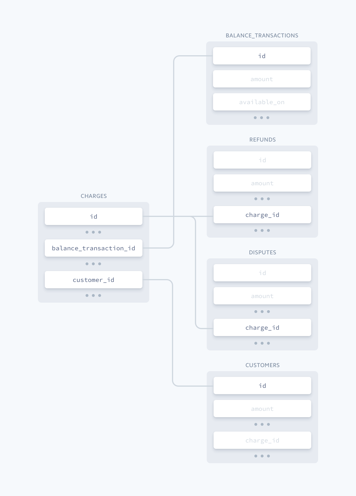 Use the data in the tables within the schema for reporting on your account’s balance activity. The tables in the Payment Tables sections represent funds that flow between your customers and your Stripe account, such as charges or refunds. The Transfer Tables section has information about transfers of your Stripe account balance to your bank account (payouts).