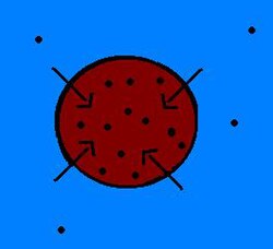 [edit | edit source]- When the solute concentration outside of a cell is higher than the solute concentration inside of a cell. Hence the cell shrinks since the water from inside of the cell rushes outside of the cell in order to equilibrate the solute concentrations inside and outside of the cell. Fish such as salmon have to excrete salt from their gills to prevent themselves from being in a hypertonic solution.