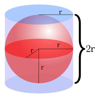 where r is the radius and d is the diameter of the sphere. Archimedes first derived this formula (On the Sphere and Cylinder c. 225 BCE) by showing that the volume inside a sphere is twice the volume between the sphere and the circumscribed cylinder of that sphere (having the height and diameter equal to the diameter of the sphere).[6] This may be proved by inscribing a cone upside down into semi-sphere, noting that the area of a cross section of the cone plus the area of a cross section of the sphere is the same as the area of the cross section of the circumscribing cylinder, and applying Cavalieri's principle.[7] This formula can also be derived using integral calculus (i.e., disk integration) to sum the volumes of an infinite number of circular disks of infinitesimally small thickness stacked side by side and centered along the x-axis from x = −r to x = r, assuming the sphere of radius r is centered at the origin.