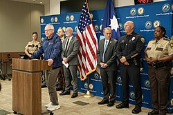 In response to the shooting, the governor's office activated the State Emergency Operations Center.[12] Local authorities and federal law enforcement[89][90] launched the largest manhunt in Minnesota history to find the shooter.[13][53] A shelter-in-place order was issued in Brooklyn Park.[12] Because the attacker had impersonated a police officer, residents were advised not to open the door to police unless two officers were present.[91] The FBI offered a $50,000 reward for information leading to his capture.[92][93] Images of Boelter were released showing him wearing a light-colored cowboy hat, dark long-sleeved shirt or jacket, light-colored pants, and dark sneakers.[94]
