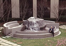 In 1969, AT&T began plans to construct an administration corporate complex in the suburbs. In early 1970, AT&T began purchases of land in the suburbs of New Jersey for this office complex and began construction in 1974. The award-winning architect, Vincent Kling, designed a Fordism[56] style, luxurious "Pagoda"[57] campus layout and the construction firms: New York–based Walter Kidde and Newark, New Jersey–based Frank Briscoe, managed this joint venture construction project with Vollers Construction of Branchburg, New Jersey, as the subcontractor. The 295 North Maple Avenue and Interstate 287 location of Basking Ridge in Bernards Township, New Jersey was completed in 1975 for the AT&T General Department offices. Employees began moving, in November 1975, to the seven inter-connected building complex using 28 acre of the property. The property had a 15-acre underground parking garage with spaces for 3,900 vehicles, and included a Class 1 licensed private helipad, a two-story cafeteria, a wood-burning fireplace, an indoor waterfall at the entrance lobby, and a seven-acre created lake for flood control. The entire property was 130 acre and cost $219 million to construct. Later, across the street from the complex, AT&T purchased additional land and established its Learning Center in 1985, at 300 North Maple Avenue, to become a 171 conference room inn. The AT&T Learning Center won the commercial property known as Somerset County's Land Development Award that year. In 1992, Basking Ridge location would become a corporate headquarters just before AT&T leased the New York City, 550 Madison Avenue building to Sony in 1993. The corporate statue, known as "Golden Boy" was moved in 1992, from the former New York City headquarters to this current New Jersey headquarters. In 1992, a corporate art consultant approached, artist sculptor, Elyn Zimmerman, to commission a 30-foot diameter project with fountain and seating area for the conference center courtyard gardens. In 1994, the project was completed and had one 34 ton granite boulder centered on top of the other boulders, which flowed water from the fountain designed by fountain engineer, Dr. Gerald Palevsky.[58] AT&T occupancy at the location peaked to 6,000 employees in its heyday before AT&T experienced competition and downsizing.