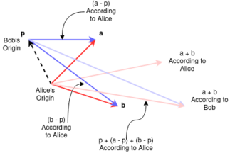 Similarly, Alice and Bob may evaluate any linear combination of a and b, or of any finite set of vectors, and will generally get different answers. However, if the sum of the coefficients in a linear combination is 1, then Alice and Bob will arrive at the same answer.