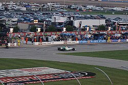 Rossi's second-place finish at Indianapolis sparked a run of three such finishes in four races as he also finished second at the first Detroit race and at Texas.[103] At Road America in June, Rossi broke through to win with a 28.4-second margin of victory over second-place Will Power.[104] Power stated after the race that he "never actually saw" Rossi due to the length of the gap between the two drivers.[105] At Pocono, Rossi was involved in a first-lap incident with Takuma Sato, with Rossi calling Sato's driving "disgraceful" and saying, "I can't even begin to understand after last year how Takuma thinks any sort of driving like that is acceptable."[106] Rossi would go on to enter the final race at Laguna Seca second in points before fading to third behind Newgarden and Pagenaud.[107]