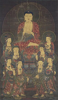 The earliest Buddhist sutra mentioning Amitābha is the translation into Chinese of the Pratyutpanna Samādhi Sūtra (般舟三昧經; Bozhōu Sānmèi Jīng) by the Kushan monk Lokakṣema. This text has been dated to between the 1st century BCE and 2nd century CE by modern buddhologists and may have been translated from the Gandhari language (a fragment of which was discovered in 2018).[20][21] Other important Mahayana texts which mention Amitabha and his pure land of Sukhavati include the Ajitasena Sutra, the Lotus Sutra, the Nirvana Sutra, the Mahāmegha Sutra, and the Samādhirāja Sūtra.[22][23][24][25] There are also several Indian Dhāraṇī sutras (sutras focused on specific magical chants) which are focused on Amitābha including various editions of the Amitabha Pure Land Rebirth Dhāraṇī, as well as the Sūtra of the Dhāraṇī of the King of the Sound of Amitābha's Drum, the Anantamukhanirhāra-dhāraṇī and the Fundamental Dhāraṇī of Immeasurable Life Tathagata (T.930).[26][27] Jeff Wilson writes that over a fifth of the sutras in the Taishō Tripiṭaka reference Amitābha,[28] but three sutras in particular have become seen as canonical in East Asian Buddhism: the two Sukhāvatīvyūha Sūtras discussed above and the Amitāyus Contemplation Sūtra.[29] The Contemplation Sūtra is believed to have been translated into Chinese by Kalayāśas in the early fifth century and belongs to a group of texts focused on the visualization of Buddhas.[30] Unlike other Pure Land sūtras, the Contemplation Sūtra emphasizes meditative practices to have a vision of Amitābha, including thirteen stages of visualization. These include meditating on the setting sun, pure water turning into beryl, and eventually visualizing the entire Pure Land with its jeweled pavilions, lotus throne, Amitāyus (Amitābha), and his attendant Bodhisattvas, Avalokiteśvara and Mahāsthāmaprāpta.[30]