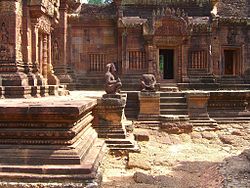In 1923, aged 22, Malraux and Clara left for the French Protectorate of Cambodia.[17] Angkor Wat is a huge 12th century temple situated in the old capital of the Khmer Empire. Angkor (Yasodharapura) was "the world's largest urban settlement" in the 11th and 12th centuries supported by an elaborate network of canals and roads across mainland Southeast Asia before decaying and falling into the jungle.[18] The discovery of the ruins of Angkor Wat by Westerners (the Khmers had never fully abandoned the temples of Angkor) in the jungle by the French explorer Henri Mouhot in 1861 had given Cambodia a romantic reputation in France, as the home of the vast, mysterious ruins of the Khmer empire. Upon reaching Cambodia, Malraux, Clara and friend Louis Chevasson undertook an expedition into unexplored areas of the former imperial settlements in search of hidden temples, hoping to find artifacts and items that could be sold to art collectors and museums. At about the same time archaeologists, with the approval of the French government, were removing large numbers of items from Angkor - many of which are now housed in the Guimet Museum in Paris. On his return, Malraux was arrested and charged by French colonial authorities for removing a bas-relief from the exquisite Banteay Srei temple. Although he was guilty, his arrest and imprisonment were deemed inappropriate – for the crime was of no consequence. Clara, his wife, started a campaign for his acquittal and a number of notable arts and literary figures signed a petition defending Malraux: among them were François Mauriac, André Breton and André Gide. Malraux had his sentence reduced to a year, and then suspended.[19]