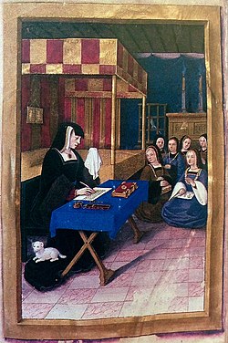 Anne was also a patron of the arts and enjoyed music. A prolific collector of tapestries, it is very likely that the unicorn tapestries now on view at The Cloisters museum in New York City were commissioned by her in celebration of her wedding to Louis XII.[59] Of her four surviving illuminated manuscript books of hours the most famous is the Grandes Heures of Anne of Brittany. She also supported printed books and their authors, for example commissioning a more modern French version, for print, of Christine of Pizan's book The City of Ladies,[9] of a century earlier.