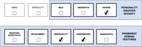 | Symptoms | Pervasive deviance, deception, impulsivity, irritability, aggression, recklessness, manipulation, callous and unemotional traits, feelings of contempt |