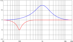 Second-order filters are capable of resonance (or anti-resonance) around a particular frequency. The response of a second-order filter is specified not only by its frequency but also its Q; a higher Q corresponds to a sharper response (smaller bandwidth) around a particular center frequency. For instance, the red response in the accompanying image cuts frequencies around 100 Hz with a higher Q than the blue response, which boosts frequencies around 1000 Hz. Higher Q's correspond to resonant behaviour in which the half-power or −3 dB bandwidth, BW, is given by: