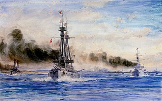 [edit]Spee's cruisers—Gneisenau and Nürnberg—approached Stanley first. At the time, most of the British fleet was coaling, but under short notice to steam. Some believe that had Spee pressed the attack, Sturdee's ships would have been easy targets,[15] although this is a subject of conjecture as two ships were under steam acting as guardships and the battleship Canopus was also present. The Germans were surprised by gunfire from an unexpected source - the Canopus, which had been grounded as a guardship and was behind a hill. This was enough to check the Germans' advance. The sight of the distinctive tripod masts of the British battlecruisers confirmed to the Germans that they were facing a better-equipped enemy. HMS Kent was already making her way out of the harbour and had been ordered to pursue Spee's ships.
