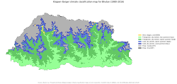 [edit]In Bhutan forest cover is around 71% of the total land area, equivalent to 2,725,080 hectares (ha) of forest in 2020, up from 2,506,720 hectares (ha) in 1990. In 2020, naturally regenerating forest covered 2,704,260 hectares (ha) and planted forest covered 20,820 hectares (ha). Of the naturally regenerating forest 15% was reported to be primary forest (consisting of native tree species with no clearly visible indications of human activity) and around 41% of the forest area was found within protected areas. For the year 2015, 100% of the forest area was reported to be under public ownership.[80][81]