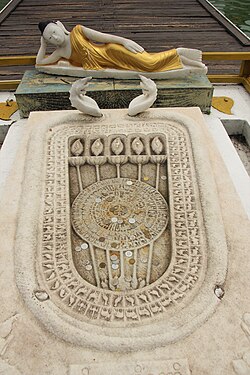 [edit]Footprints of the Buddha abound throughout Asia, dating from various periods.[2]: 86 Japanese author Motoji Niwa (丹羽基二, Niwa Motoji), who spent years tracking down the footprints in many Asian countries, estimates that he found more than 3,000 such footprints, among them about 300 in Japan and more than 1,000 in Sri Lanka.[3] They often bear distinguishing marks, such as a Dharmachakra at the centre of the sole, or the 32, 108 or 132 auspicious signs of the Buddha, engraved or painted on the sole.[4]