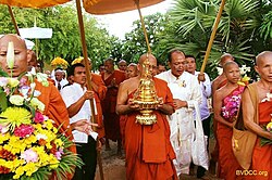 [edit]Following the defeat of the Khmer Rouge by Vietnamese forces, Buddhism initially remained officially suppressed in Cambodia.[18] Following challenges to the legitimacy of the Vietnamese-backed People's Republic of Kampuchea, policies towards Buddhism began to ease starting in the summer of 1979.[22] A group of monks who had been exiled and re-ordained in Vietnam during the Khmer Rouge period were sent to Cambodia,[23] and in 1981 one of their number, Venerable Tep Vong, was elected the first sangharaja of a new unified Cambodia sangha, officially abolishing the division between the Thommayut order and the Mohanikay.[22] The ordination of new monks was sponsored by the government as a public show of piety and lifted restrictions on ordination.[20]