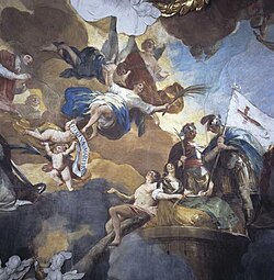 The present spacious church in Baroque style was begun in 1681[6] by Charles II, King of Spain and completed in 1686.[5] The early constructions were supervised by Felipe Sánchez[8] and were later modified by Francisco Herrera the Younger under John of Austria the Younger.[11] In 1725, the Cabildo of Zaragoza decided to change the aspect of the Holy Chapel and commissioned the architect Ventura Rodríguez, who transformed the building into its present dimensions of 130 meters long by 67 wide, with its eleven cupolas and four towers. The area most visited is the eastern part of the chapel, because this is where the Holy Chapel by Ventura Rodríguez (1754) is built, which houses the venerated image of the Virgin. Around the Holy Chapel are the vaults or domes painted with frescoes by Francisco Goya: The Queen of Martyrs and Adoration of the Name of God.[10] The gilt covering and other ornamentation throughout the building were designed and overseen by Goya's father José.[12] By 1718, the church's vaults had been completed. However, it was not until 1872 that the final touches were put to these vaults, when the main dome and the final spire were finished.[8]