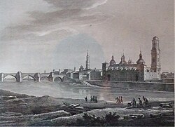 Numerous churches have been built upon this site through the years. The tiny chapel built by Saint James later gave way to a basilica-like enclosure during Constantine I's time, subsequently being transformed into Romanesque, then Gothic then Mudéjar styles.[8] The venerated shrines at Zaragoza date to the Christian Reconquest by King Alfonso I in 1118.[9] A church in the Romanesque style was built under the pontificate of Pedro de Librana[8] who is also credited with the oldest written testimonial to the Virgin at Zaragoza.[6] A tympanum on the south wall of this Romanesque church still stands.[8]