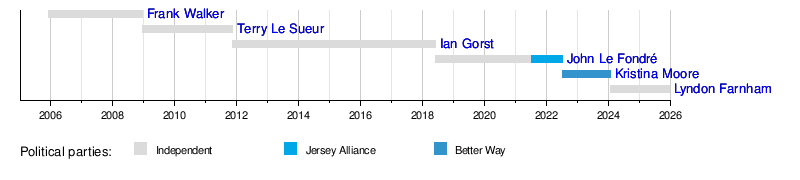 For the 2022 general election, the title of Senator was abolished and all candidates stood as Deputies or Constables.[12] As Senators were the only position to be elected using an island-wide vote, they traditionally took on the Ministerial roles in Jersey's government. 2022 would be the first time a Chief Minister would be appointed without an island-wide mandate since the position was established in 2005.