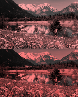 [edit]The "Land effect" is the capacity to see full color images solely by looking at superimposed images of black and white transparencies of the same scene, one taken through a red filter and the other taken through a green filter, and illuminated by red and white light, respectively (or even by two different yellow wavelengths). The effect was discovered by Edwin H. Land, who was attempting to reconstruct James Clerk Maxwell's early experiments in full-colored images. Land saw that, even when only yellow light illuminated the superimposed images, the visual system would still perceive a full (if muted) range of color. Land described this effect in a 1959 article in Scientific American.[29][4] In 1977, Land wrote another Scientific American article that described a generalized Land effect, leading to formulation of his "Retinex Theory" to explain what he believed was main basis of human color vision.[30] The word "retinex" is a blend of "retina" and "cortex", suggesting that both the eye and the brain are involved in the processing.