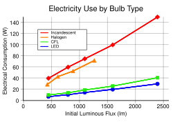 [edit]While the purchase price of a CFL is typically 3–10 times greater than that of an equivalent incandescent lamp, a CFL lasts 8–15 times longer and uses two-thirds to three-quarters less energy. A US article stated "A household that invested $90 in changing 30 fixtures to CFLs would save $440 to $1,500 over the five-year life of the bulbs, depending on your cost of electricity. Look at your utility bill and imagine a 12% discount to estimate the savings."[47]