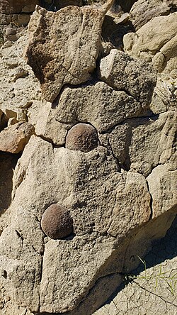 Cannonball concretions are large spherical concretions, which resemble cannonballs. These are found along the Cannonball River within Morton and Sioux Counties, North Dakota, and can reach 3 m (9.8 ft) in diameter. They were created by early cementation of sand and silt by calcite. Similar cannonball concretions, which are as much as 4 to 6 m (13 to 20 ft) in diameter, are found associated with sandstone outcrops of the Frontier Formation in northeast Utah and central Wyoming. They formed by the early cementation of sand by calcite.[60] Somewhat weathered and eroded giant cannonball concretions, as large as 6 meters (20 feet) in diameter, occur in abundance at "Rock City" in Ottawa County, Kansas. Large and spherical boulders are also found along Koekohe beach near Moeraki on the east coast of the South Island of New Zealand.[61] The Moeraki Boulders, Ward Beach boulders and Koutu Boulders of New Zealand are examples of septarian concretions, which are also cannonball concretions. Large spherical rocks, which are found on the shore of Lake Huron near Kettle Point, Ontario, and locally known as "kettles", are typical cannonball concretions. Cannonball concretions have also been reported from Van Mijenfjorden, Spitsbergen; near Haines Junction, Yukon Territory, Canada; Jameson Land, East Greenland; near Mecevici, Ozimici, and Zavidovici in Bosnia-Herzegovina; in Alaska in the Kenai Peninsula Captain Cook State Park on north of Cook Inlet beach[62] and on Kodiak Island northeast of Fossil Beach.[63] This type of concretion is also found in Romania, where they are known as trovants.[64][65]