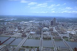 [edit]The skyline of Des Moines changed in the 1970s and the 1980s, when several new skyscrapers were built. Additional skyscrapers were built in the 1990s, including Iowa's tallest. Before then, the 19-story Equitable Building, from 1924, was the tallest building in the city and the tallest building in Iowa. The 25-story Financial Center was completed in 1973 and the 36-story Ruan Center was completed in 1974. They were later joined by the 33-story Des Moines Marriott Hotel (1981), the 25-story HUB Tower and 25-story Plaza Building (1985). Iowa's tallest building, Principal Financial Group's 45-story tower at 801 Grand was built in 1991, and the 19-story EMC Insurance Building was erected in 1997.