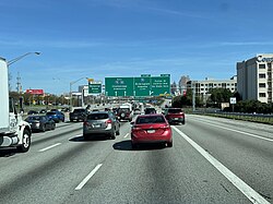 The Downtown Connector carries more than 437,000 vehicles per day at its busiest point — just south of 10th Street in Midtown, while the least traveled portion carries 243,000 vehicles per day — just south of Fulton Street, near the interchange with Interstate 20.[3] The area around the connector and associated interchanges are considered one of the ten-most congested stretches of interstate in the U.S.[4] Due to this fact, many motorists often compare Atlanta to Los Angeles, which is also known for its notoriously-congested freeway system.