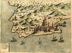 [edit]The castle was built by the Byzantine Emperor Anastasius I (r. 491–518), a native of Durrës (ancient Dyrrhachium), who was born into an Illyro-Roman family.[1][2] At the time, Anastasius made the city one of the most fortified cities on the Adriatic.[3][4] During this time a second, smaller castle was built 7km north of Durrës, modern day "Porto Romano" (The Roman's Gate).[5] The ancient walls were devastated in an earthquake in 1273, and had to be extensively repaired.