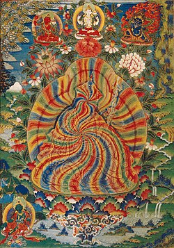 Germano sees the early Dzogchen of the Tibetan Empire period as characterized by the rejection of normative Vajrayana practice. Germano calls the early Dzogchen traditions "pristine Great Perfection" since it is marked "by the absence of presentations of detailed ritual and contemplative technique" as well as a lack of funerary, charnel ground and death imagery found in some Buddhist tantras.[9] According to Germano, instead of tantric deity yoga methods, early Dzogchen mainly focused on simple calming (śamatha) contemplations leading to a "technique free immersion in the bare immediacy of one's own deepest levels of awareness".[10] Similarly, Christopher Hatchell explains that since for early Dzogchen "all beings and all appearances are themselves the singular enlightened gnosis of the buddha All Good (Samantabhadra, Kuntu Zangpo)", there is nothing to do but to recognize this inherent awakened mind, relax and let go.[11]