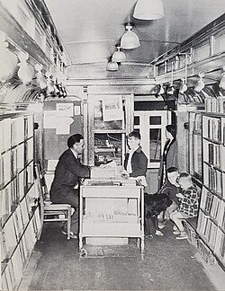 Beginning in 1941, the Edmonton Public Library began to operate traveling services to meet the needs of the community.[8] The first service operated out of a streetcar. In 1947, trucks and buses were pressed into service as bookmobiles. These were replaced by book trailers in 1974, some of which were decommissioned in 1982 as a cost-saving measure. These decommissioned trailers were replaced by the more traditional bookmobile format. 1982 also saw the implementation of data radio in the bookmobiles, which enabled them to communicate directly with the main EPL database. This allowed staff to utilize the electronic database and to review customer accounts from the bookmobile itself. The bookmobiles remained in service until 1991, when they were decommissioned.[7][9] In 2014, traveling services were reintroduced with the launch of epl2GO literacy vans.[1]