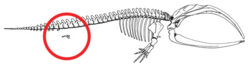 Both basilosaurids have skeletons that are immediately recognizable as cetaceans. A basilosaurid was as big as the larger modern whales, with genera like Basilosaurus reaching lengths of up to 60 ft (18 m) long; dorudontines were smaller, with genera like Dorudon reaching about 15 ft (4.6 m) long. The smallest basilosaurid whale is Tutcetus and measures 8.2 ft (2.5 m) long.[38] The large size of basilosaurids is due to the extreme elongation of their lumbar vertebrae. They had a tail fluke, but their body proportions suggest that they swam by caudal undulation and that the fluke was not used for propulsion.[1][39] In contrast, dorudontines had a shorter but powerful vertebral column. They too had a fluke and, unlike basilosaurids, they probably swam similarly to modern cetaceans, by using caudal oscillations.[21] The forelimbs of basilosaurids were probably flipper-shaped, and the external hind limbs were tiny and were certainly not involved in locomotion.[1] Their fingers, however, retained the mobile joints of their ambulocetid relatives. The two tiny but well-formed hind legs of basilosaurids were probably used as claspers when mating. The pelvic bones associated with these hind limbs were not connected to the vertebral column as they were in protocetids. Essentially, any sacral vertebrae can no longer be clearly distinguished from the other vertebrae.[1][40]