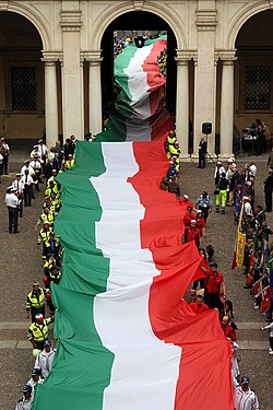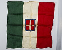The tricolour also flew over the barricades of the Ten Days of Brescia, a revolt of the citizens of the Lombard city against the Austrian Empire,[88] and in many other centres such as Varese, Gallarate, Como, Melegnano, Cremona, Monza, Udine, Trento, Verona, Rovigo, Vicenza, Belluno and Padua.[89] This spread throughout the Italian peninsula and demonstrated that the tricolour flag had by then assumed a consolidated symbolism valid throughout the national territory.[90] The iconography of the Italian flag then began to spread not only in the vexillological and military fields, but also in some everyday objects such as scarves and clothing fabrics.[91]