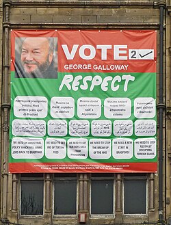 Galloway was born in Dundee, Scotland. After becoming the youngest ever chair of the Scottish Labour Party in 1981, he was general secretary of the charity War on Want from 1983 until his election as MP for Glasgow Hillhead at the 1987 general election; he was re-elected three times. The Labour Party expelled him in 2003 due to comments he made in opposition to the invasion of Iraq. Galloway joined the Respect Party in 2004, and was its leader from 2013 to 2016. He was elected as MP for Bethnal Green and Bow at the 2005 general election. After losing in the neighbouring constituency of Poplar and Limehouse at the 2010 general election, he regained a parliamentary seat at the 2012 Bradford West by-election, only to lose it at the 2015 general election. He unsuccessfully stood as an independent candidate at the 2017 and 2019 general elections. Galloway then founded the Workers Party of Britain, and stood unsuccessfully for the party at the 2021 Batley and Spen by-election. Galloway won the 2024 Rochdale by-election. He lost the seat at the 2024 general election.[2][3]