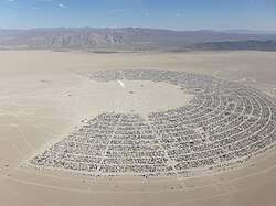 Burning Man is a week-long annual art and community event held in the Black Rock Desert in northern Nevada, in the United States. The event is described as an experiment in community, radical self-expression, and radical self-reliance. The event forbids commerce (except for ice, coffee, and tickets to the event itself)[63] and encourages gifting.[64] Gifting is one of the event's 10 principles,[65] as participants to Burning Man (both the desert festival and the year-round global community) are encouraged to rely on a gift economy. The practice of gifting at Burning Man is also documented by the 2002 documentary film Gifting It: A Burning Embrace of Gift Economy,[66] as well as by Making Contact's radio show "How We Survive: The Currency of Giving [encore]".[64]